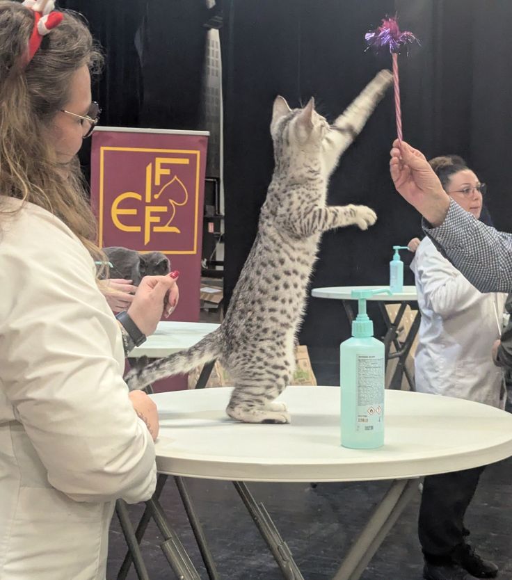 This weekend we attended the FIFE cat show at Saint James organized by the Cat Club du Grand Ouest we are members. A top cat show with a good atmosphere and enthousiasm where we could see again Marie/Fred (cattery La Cité des Maus) and Nathalie/JC (cattery La Triade Loupiots). Sechem Unimaginable was part of the show and it was the first show for our Aconit de La Triade Loupiots. 4 Egyptian Maus were present and were very appreciated by the judges. All our Maus obtained their points both days, Uni is now Premior Champion and he obtained the Best in Show on saturday ; on sunday he lost against an other mau Timon de La Cité des Maus. On sunday, our little Aconit charmed the judges by her elegance and obtained the Best in Show for kitten. Tor de La Triade performed well alsi as he was also nominated at the Best in Show for adult male on sunday. A great weekend for the Egyptian Maus and their humans !