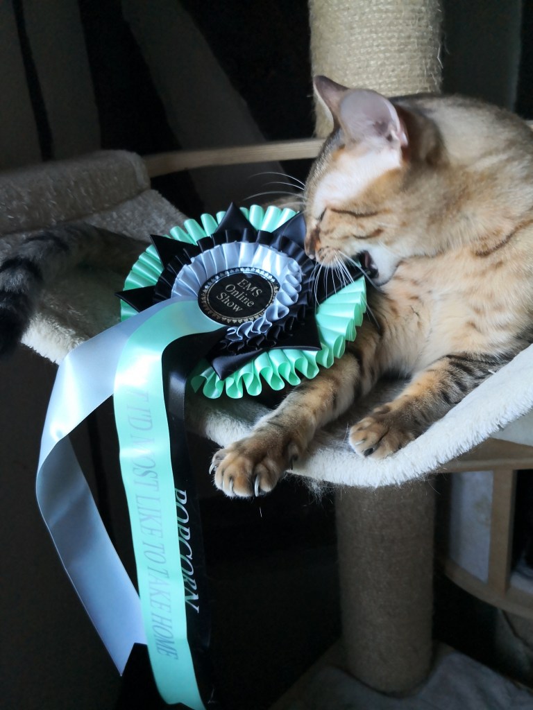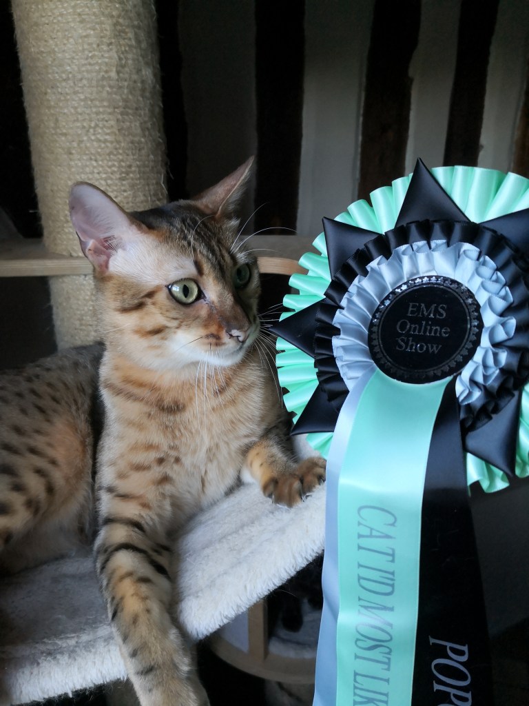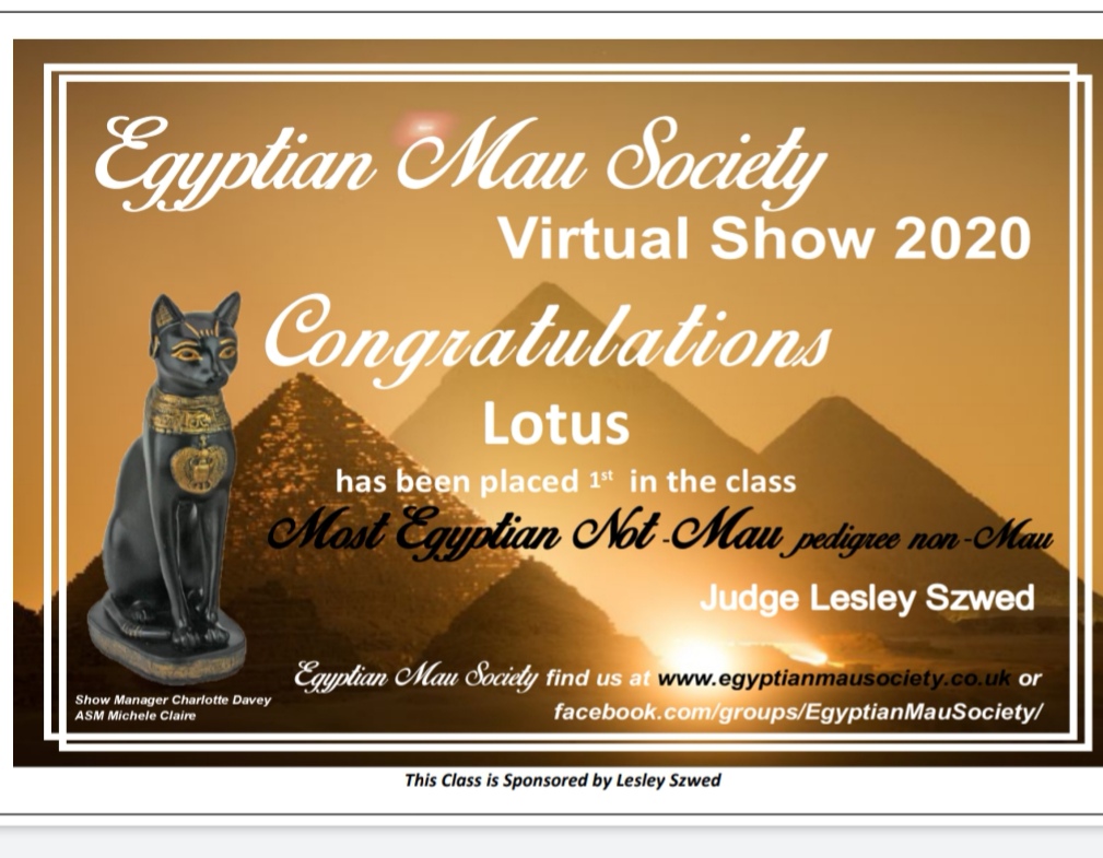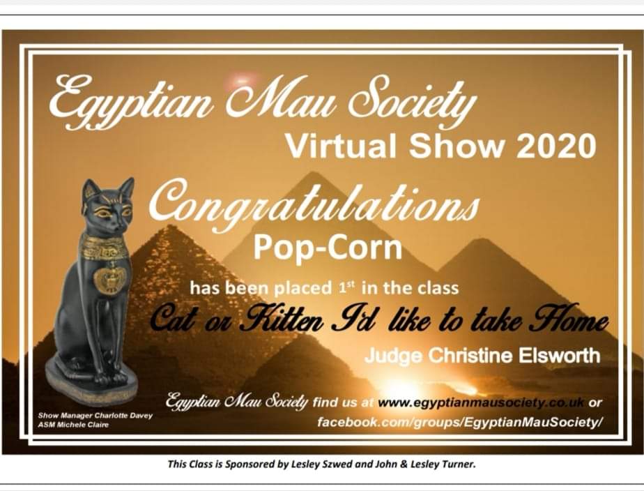 L’Egyptian Mau Society, club anglais du Mau Egyptien membre du GCCF, a eu la très bonne idée d’organiser un Virtual Show sur Facebook. Ce show était ouvert à tous les propriétaires de Maus Egyptiens, mais pas que, puisqu’une catégorie existait pour les chats « non-Maus » Nous avons participé avec grand plaisir en postant des photos de Stiina, Hotep, Moeris, Netanya, Praline, Physalis, Pop-Corn et Lotus. Et surprise ! 2 de nos petits félins ont obtenu une 1ère place :