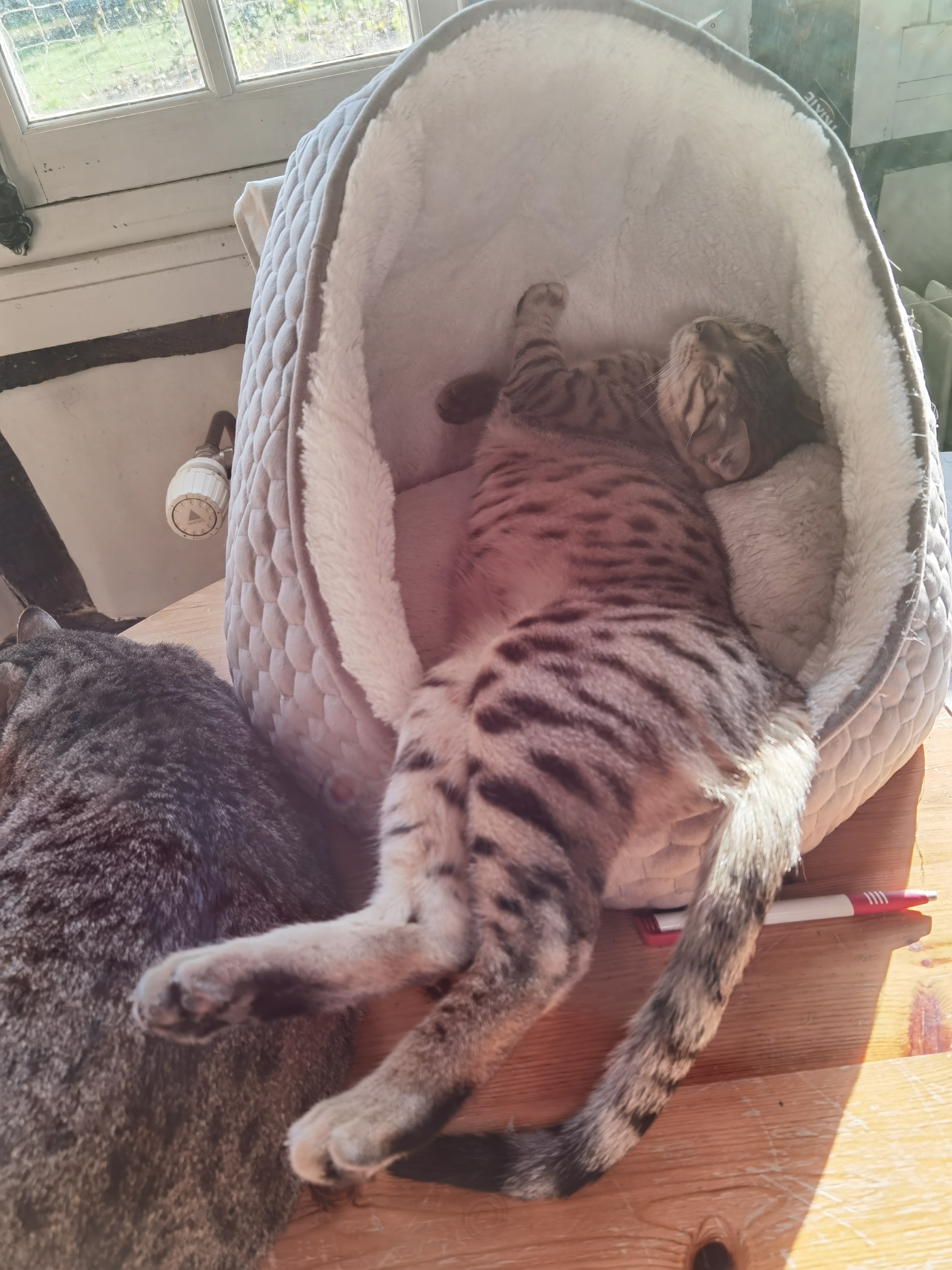 Le Mau Egyptien, chat des pharaons…. Hum…Pas toujours très distingué surtout les garçons. Pop-Corn et Rocky nous offrent un florilège de positions comiques pour dormir.