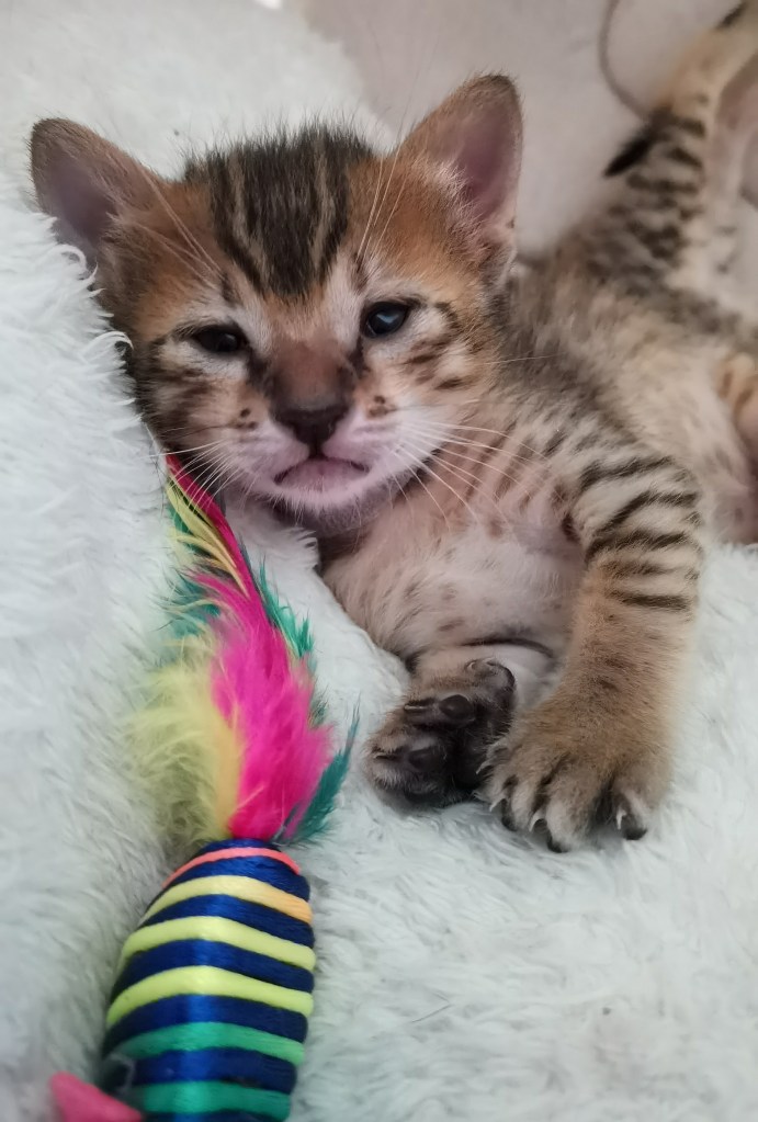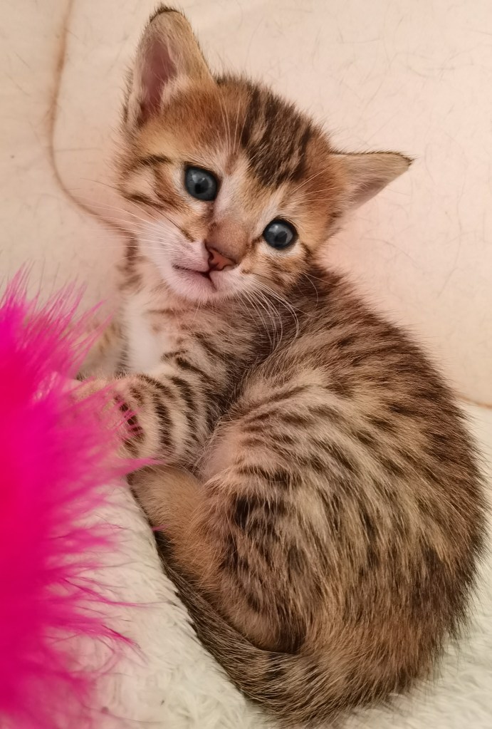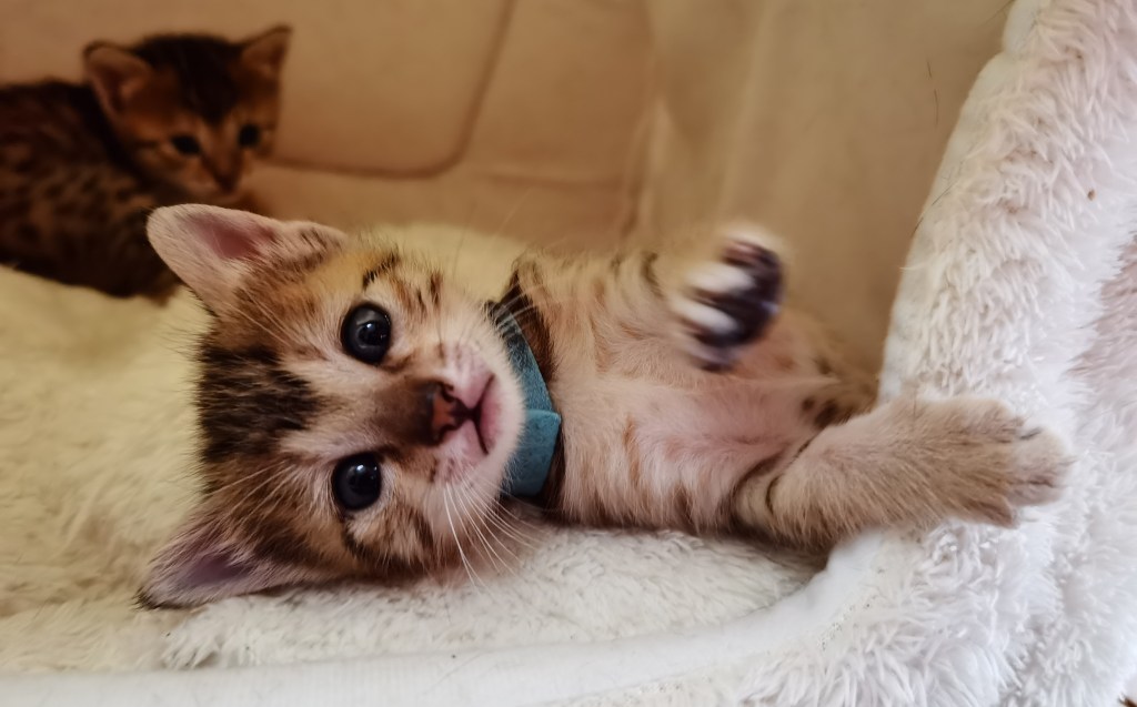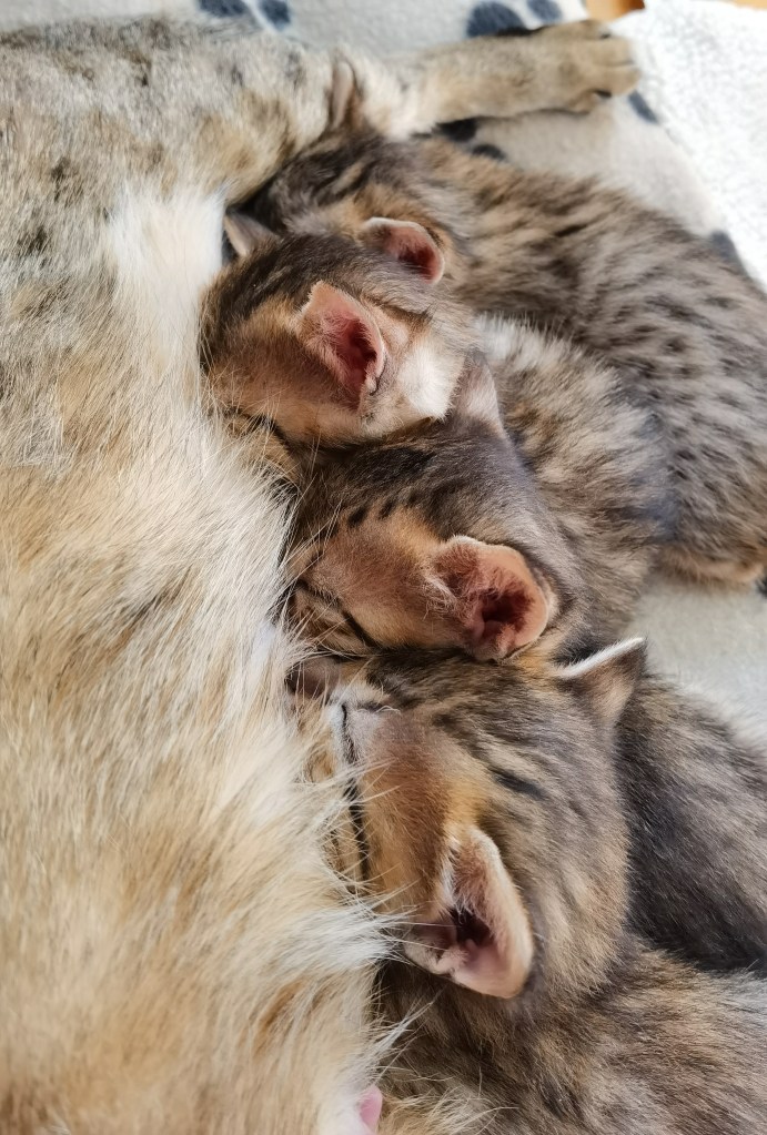 Nous sommes âgés de 3.5 semaines et c’est parti nous découvrons notre environnement avec d’enthousiasme. Nous jouons beaucoup entre nous, au fait nous sommes donc 3 filles et 1 gars, le garçon c’est le plus gros il tête tout le temps. A ce sujet, la nourriture que maman mange semble être appétissante, d’ici peu nous y goûterons même si le lait de maman c’est ce qu’il y a de meilleur pour le moment !