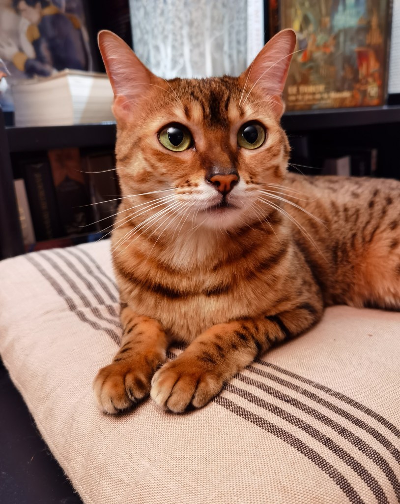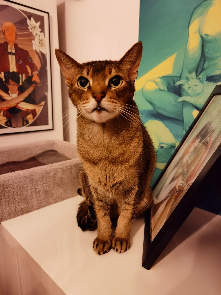 Quel bonheur pour un éleveur de revoir ses chatons devenus grands ! Hier nous avons retrouvé Sechem Sekhmet (ex Pivoine) née du mariage entre Amiel-Goshen Netanya et Hotep de la Grande Pyramide en 2019, aux dires de ses adoptantes la demoiselle nous a reconnus. Sekhmet est devenue une très belle Mau Egyptien, vive et joueuse ; elle ressemble indéniablement à son papa de part sa couleur bronze chaud et ses yeux tout ronds. Nous avons aussi fait la connaissance du très élégant Floridas, la dernière membre de la famille féline Morrigan s’est montrée discrète mais nous ne désespérons pas de la voir lors d’une prochaine visite :0) Ce séjour à Paris a aussi été l’occasion de ramener un souvenir qui allie mon amour des chats et mes origines.