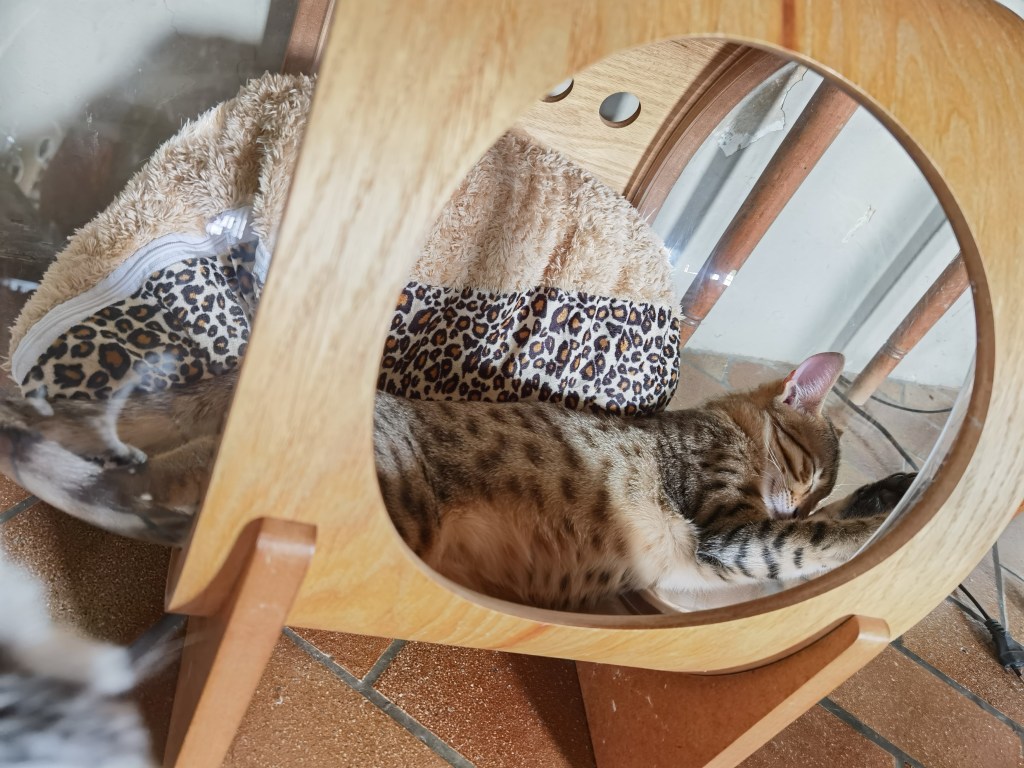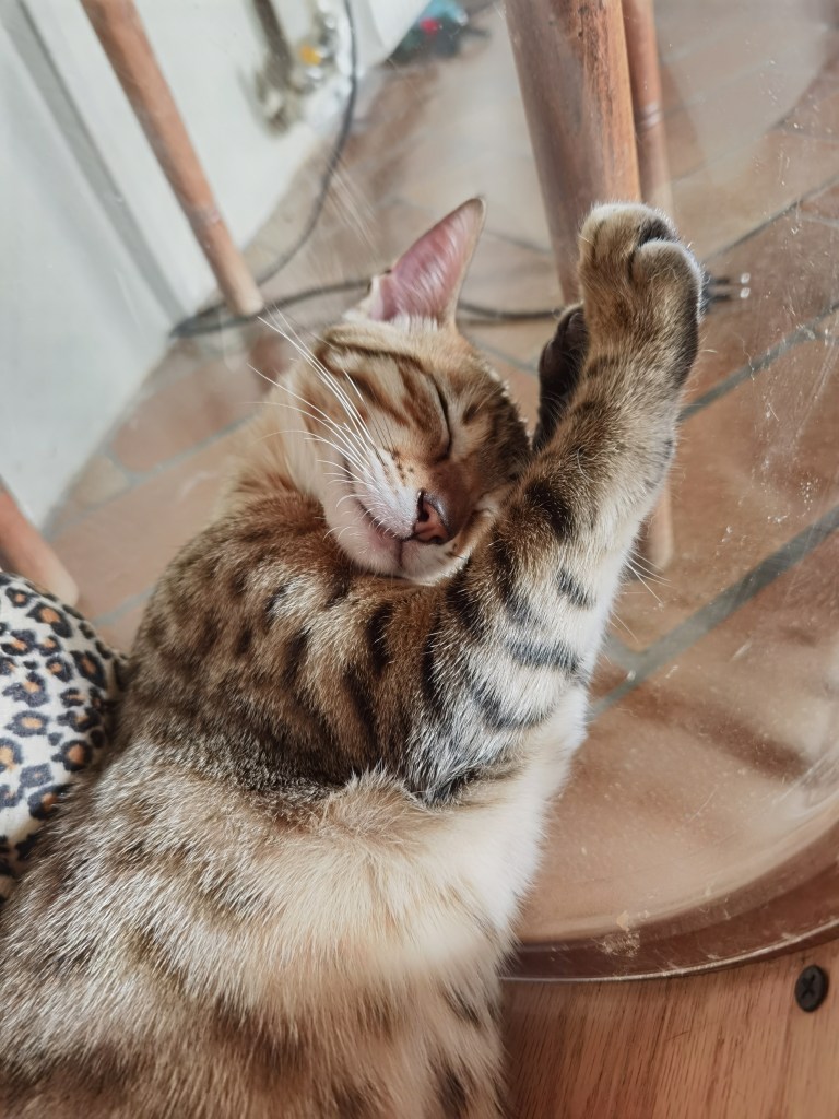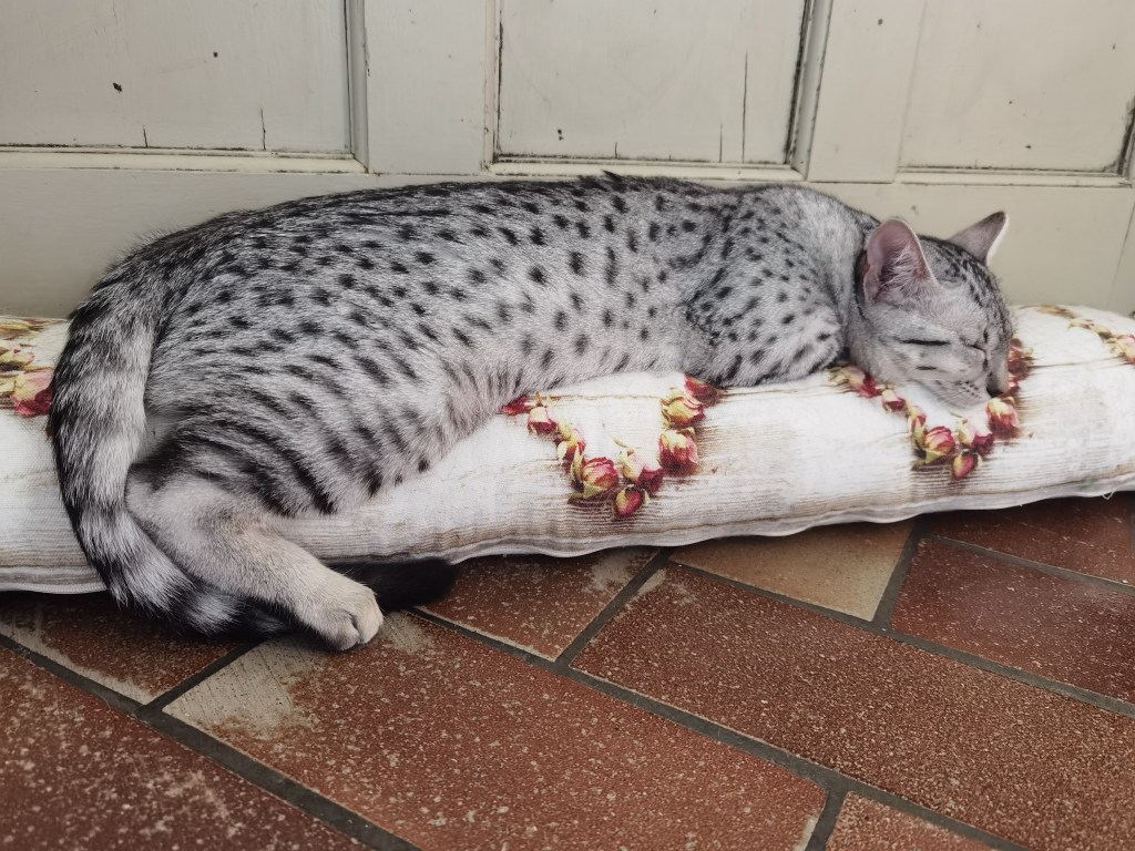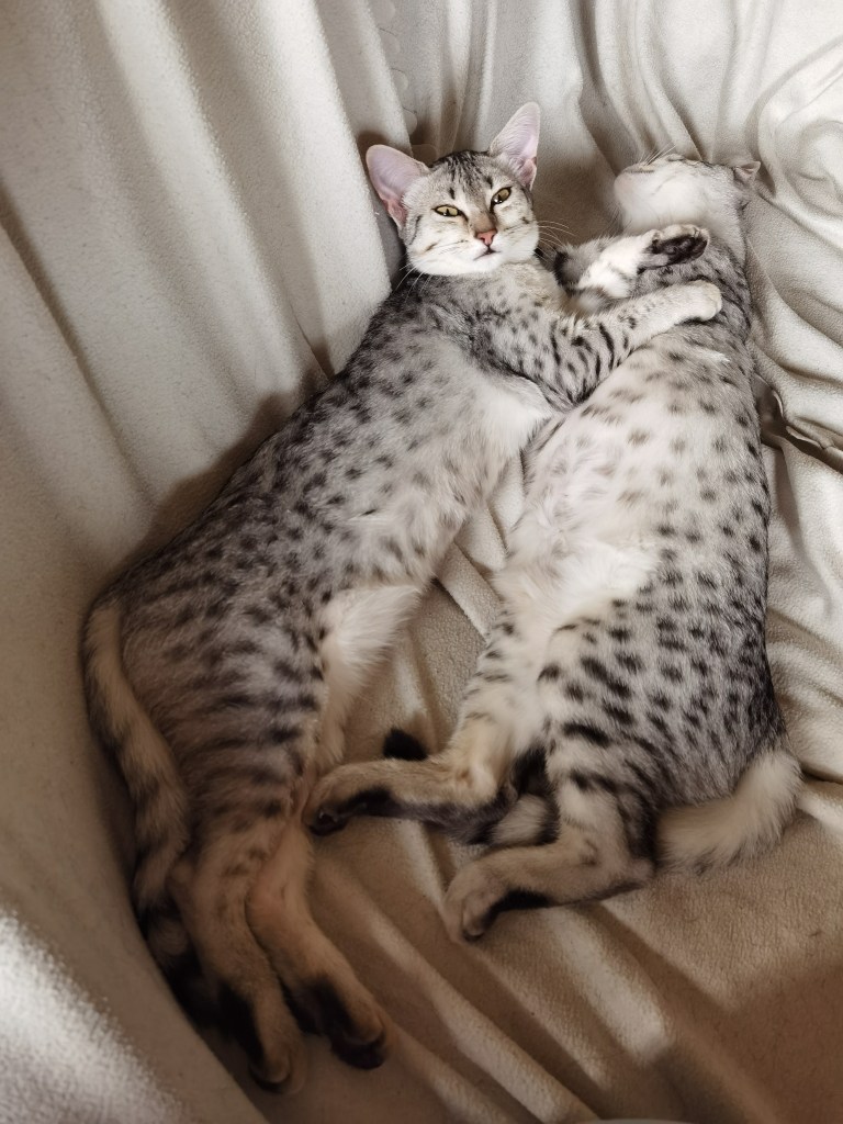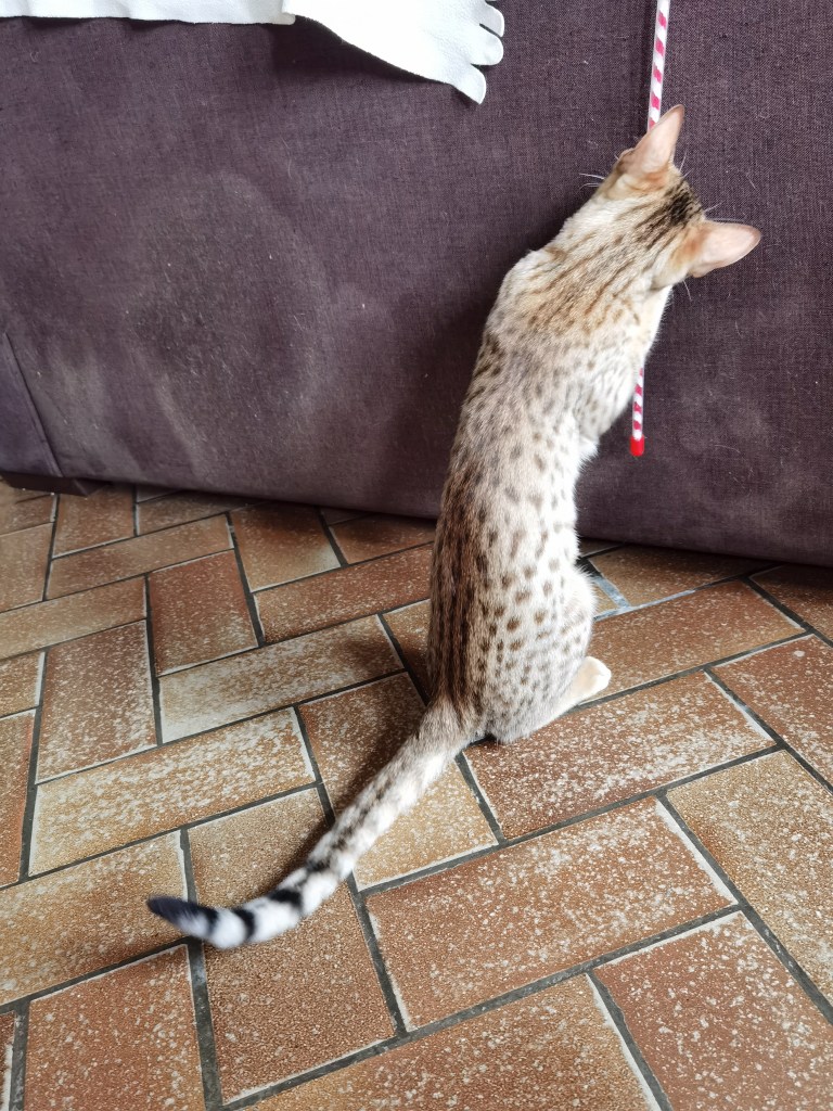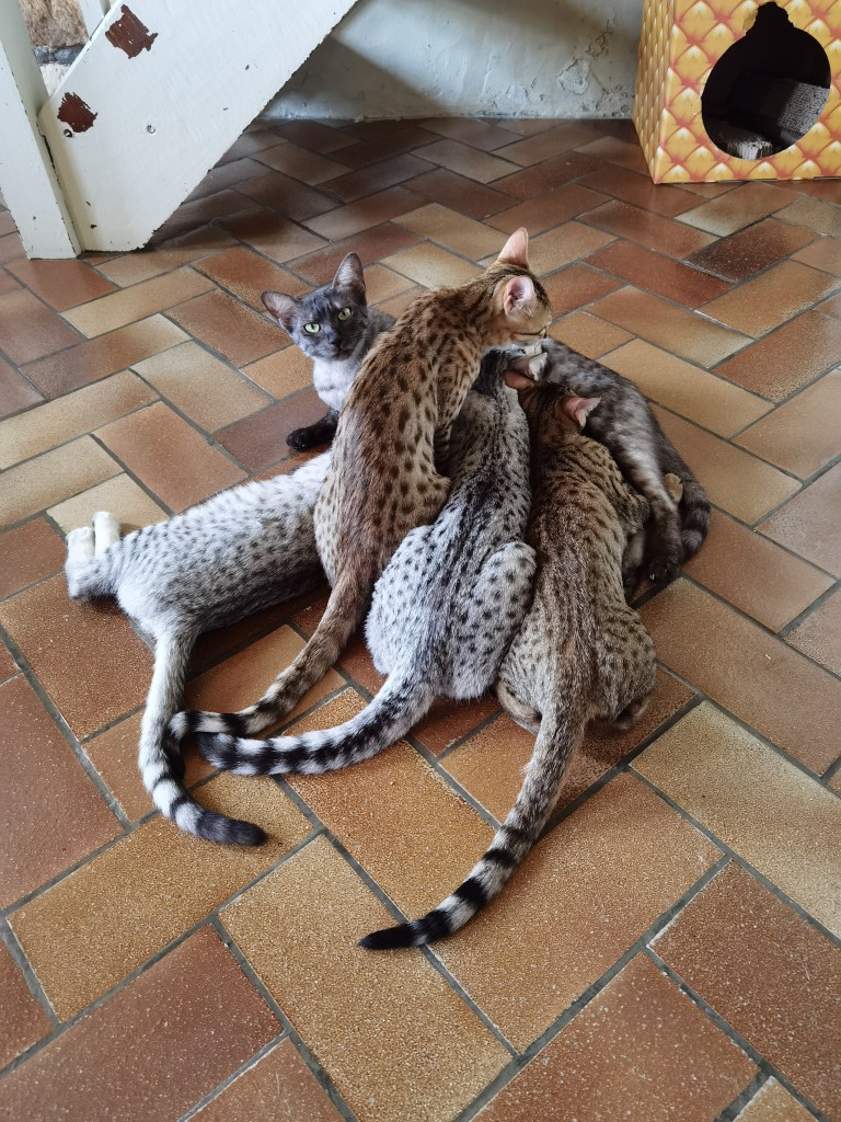 Sechem Physalis, the mum of our 5 bronze Egyptian Maus born on the 07th of March, has found again her line. She also started again the cuddles session with her humans on the sofa.
