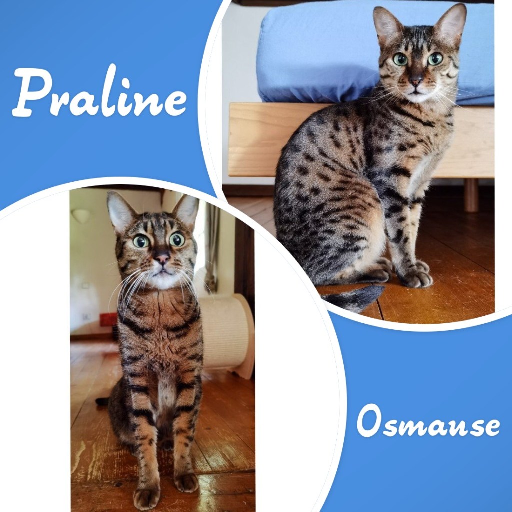 Comme tous les ans depuis 2 étés, Sechem Osmause est venu passer quelques jours de vacances à la maison. Ce superbe Mau Egyptien à la couleur bronze si particulière reconnait immédiatement les lieux et s’intègre très vite à notre tribu féline. Sur les photos vous pouvez voir également sa sœur Praline avec qui il a une indéniable ressemblance. En effet, Osmause et Praline ont les même parents : Amiel-Goshen Netanya (maman) et Hotep de la Grande Pyramide (papa), mais ils sont de 2 portées différentes. Bonnes vacances Osmause !