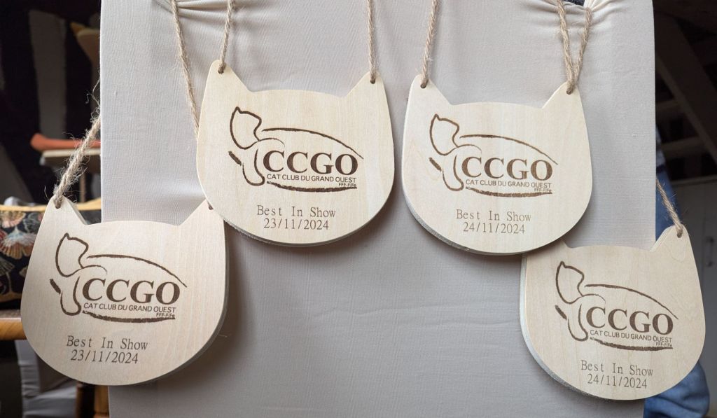 This week end we attended the international cat show organized by the Cat Club du Grand Ouest. The opportunity for our oriental Lotus des Terres d’Asgard to see again her breeder Cécile Guillard and to won the Best in Show both days in her category. Sechme Unimaginable (Uni) and Unbelievable (Lili) were also part of the show, our 2 bronze Egyptian Mau started their path in the adult class. Uni obtained the Best in Show both days, our Lili had more competitors and failed for the nomination against an oldest beautiful brtish shorthair. All our treasures behaved very well, they tried to charm the judges.