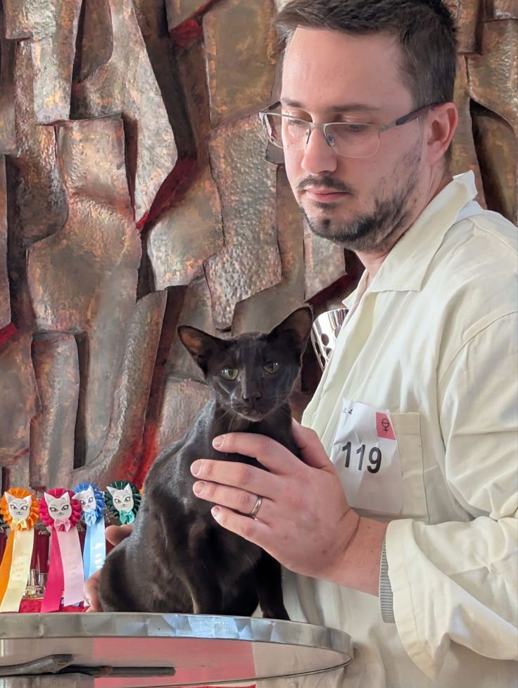 Ce week end nous avons participé à l’exposition internationale féline FIFE organisée par le Cat Club du Grand Ouest. L’occasion pour notre orientale Lotus des Terres d’Asgard de revoir son éleveuse Cécile Guillard et de remporter le Best in Show dans sa catégorie les 2 jours. Sechem Unimaginable (Uni) et Unbelievable (Lili) étaient également du voyage, nos 2 Maus Egyptiens bronzes ont commencé leur parcours dans la classe adulte. Unimaginable a été élu Best in Show les 2 jours , notre petite Lili avait davantage de concurrence et s’est inclinée aux nominations face à une superbe British poil court plus agée qu’elle. Nos trésors se sont très bien comportés, faisant même un peu de charme aux juges.