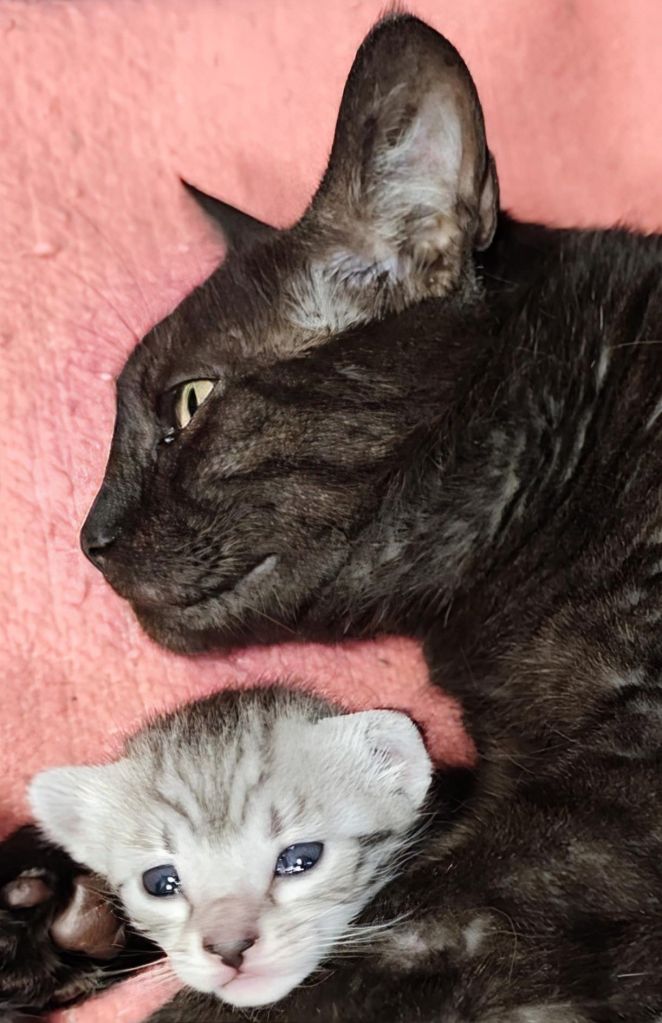 Je m’appelle Aconit et je suis née en Bourgogne chez Nathalie et JC, mon nom est celui d’une plante dont les fleurs en forme de casque de Minerve sont très belles. Mon adorable maman Phoebe de la Triade Loupiots est de couleur smoke, mon superbe papa Tor de la Triade Loupiots est de couleur bronze et moi je suis une demoiselle Mau Egyptien silver. J’ai déjà un petit caractère bien affirmé, curieuse, vive, téméraire et ma future famille a hâte de m’accueillir mais il va falloir attendre un peu car j’ai tout juste 1 mois et j’ai encore tellement à apprendre avant de rejoindre la Normandie.