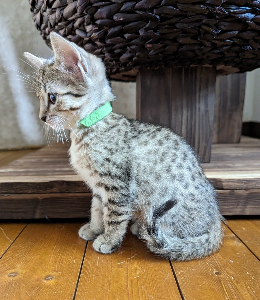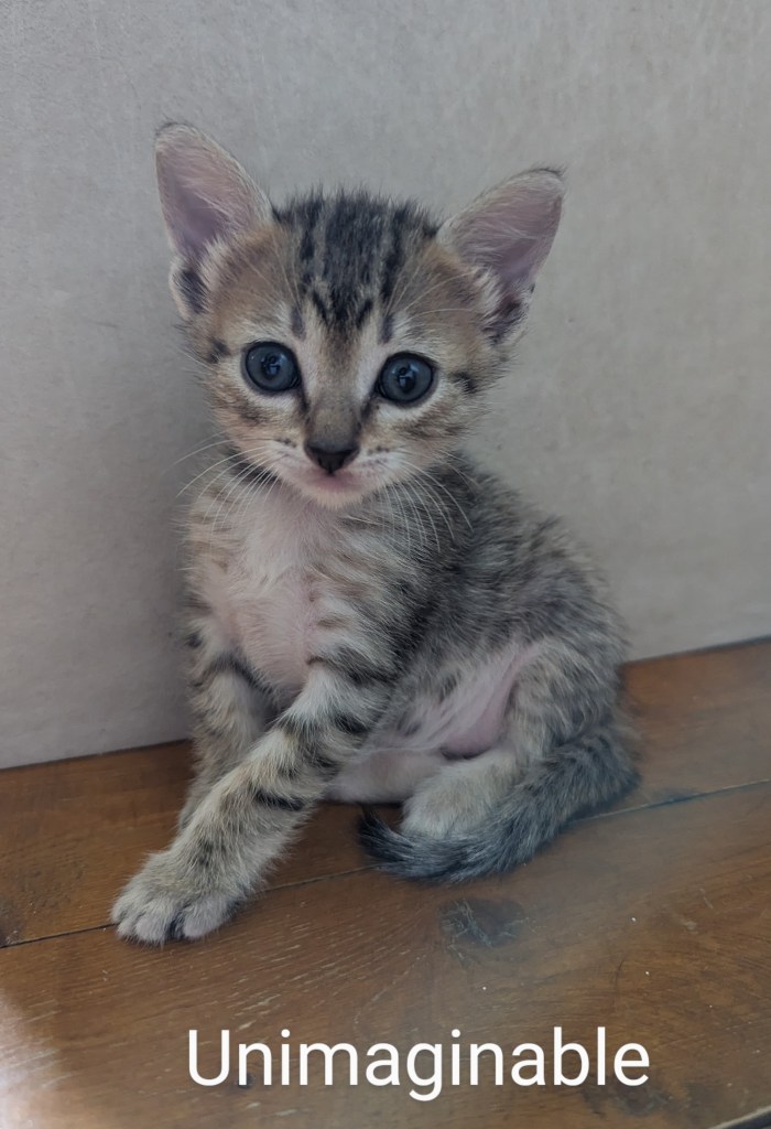 So, starting with the bronze Egyptian Mau ladies, we have : Unbelievable aka Uma (blue collar), Unforgetable aka Ulli (orange collar) and Unstoppable aka Ursula (white collar).