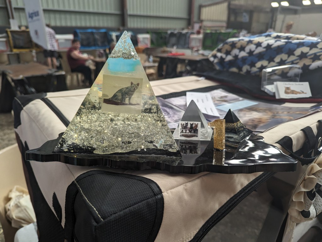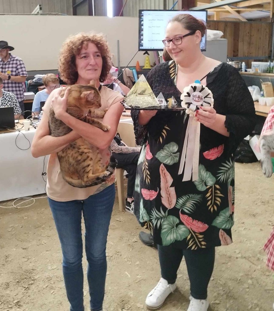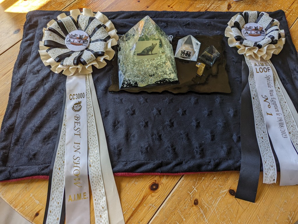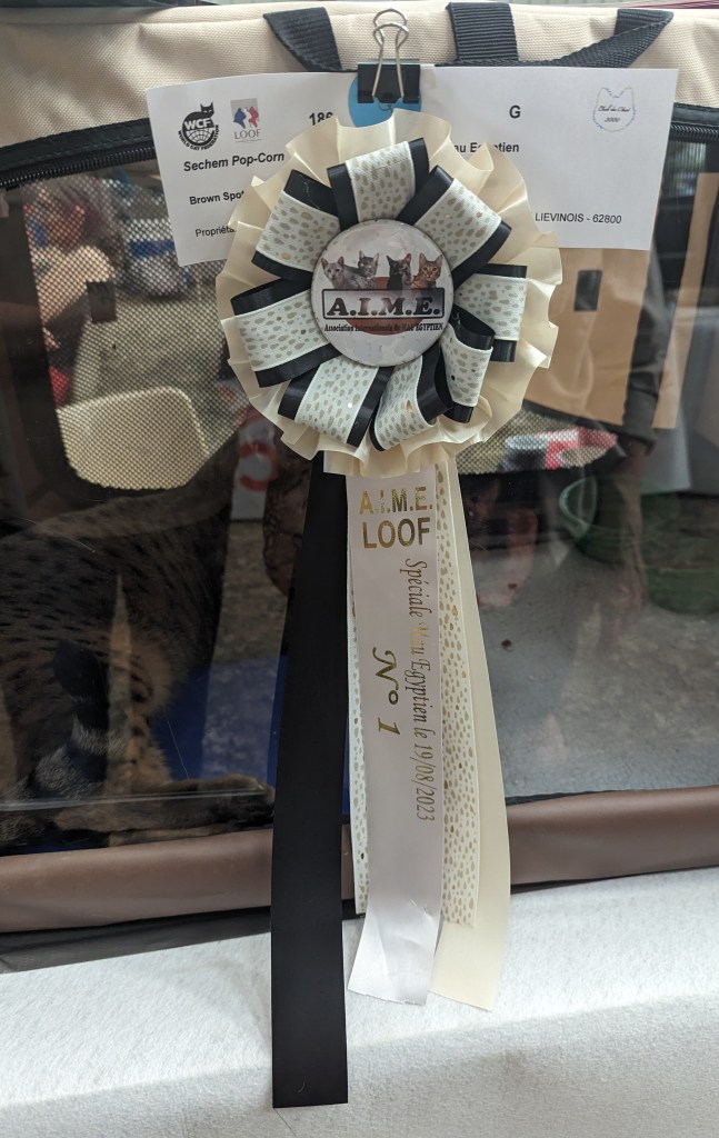 Hier Sechem Pop-Corn a participé à la spéciale de race Mau Egyptien organisée par l’Association Internationale du Mau Egyptien (AIME). Une superbe journée pour notre Pop-Corn qui a obtenu son dernier CAC devant 2 autres Maus bronzes (il devient donc champion LOOF), le Best in Show et la première place du top 10. Il est consacré meilleur Mau Egyptien parmi les 17 maus présents ! Merci à l’AIME pour son accueil, l’organisation de la spéciale et les beaux cadeaux ; merci à Mme la juge Lemaigre pour sa gentillesse. Un merci tout particulier à Nathalie GUENEAU (La Triade Loupiots) et à son mari JC pour leur aide et les bons moments passés ensemble, et félicitations à leur jeune Tor qui n’a pas démérité. Je remercie également les éleveurs qui nous ont fait confiance et pour le travail qu’ils ont effectué sur le Mau Egyptien de couleur bronze, n’oublions pas que nous ne sommes qu’un maillon d’une longue chaîne d’éleveurs passionnés.