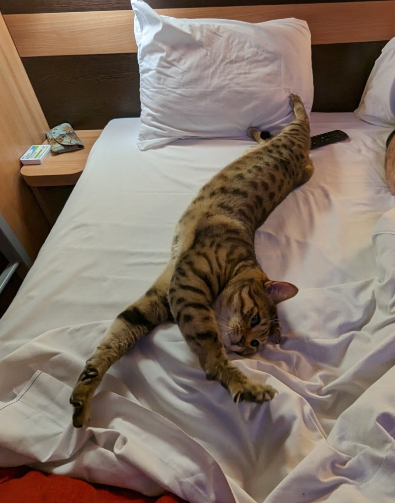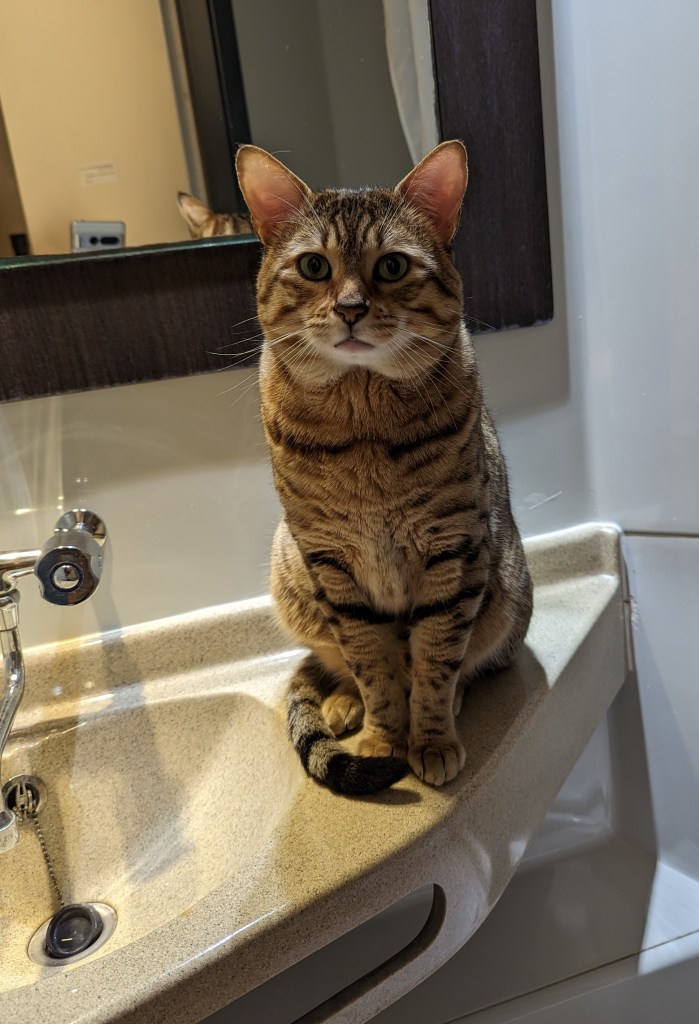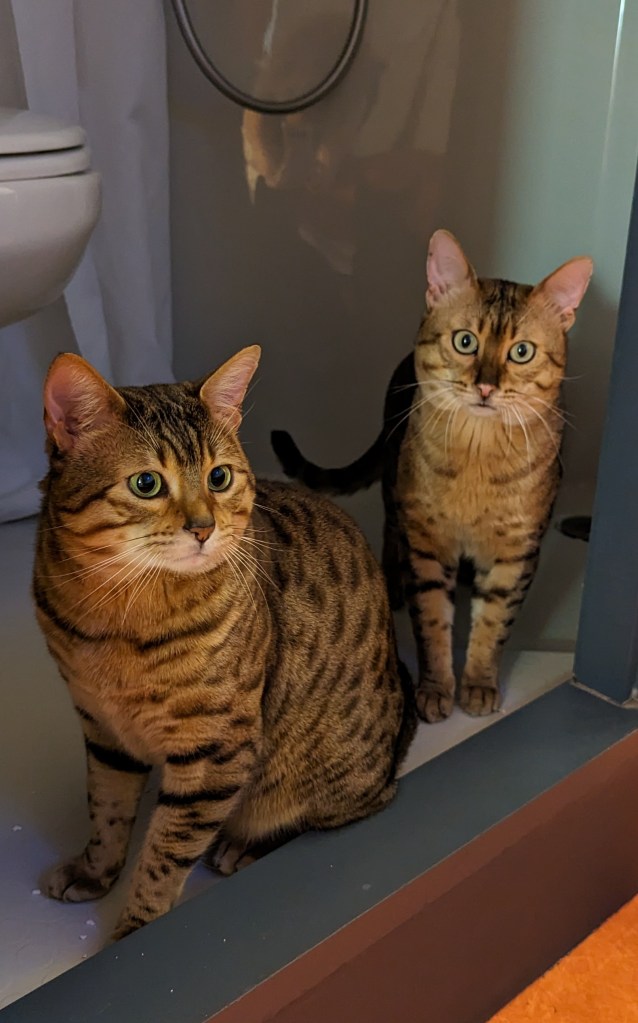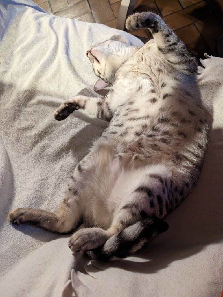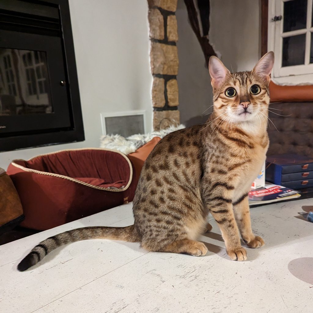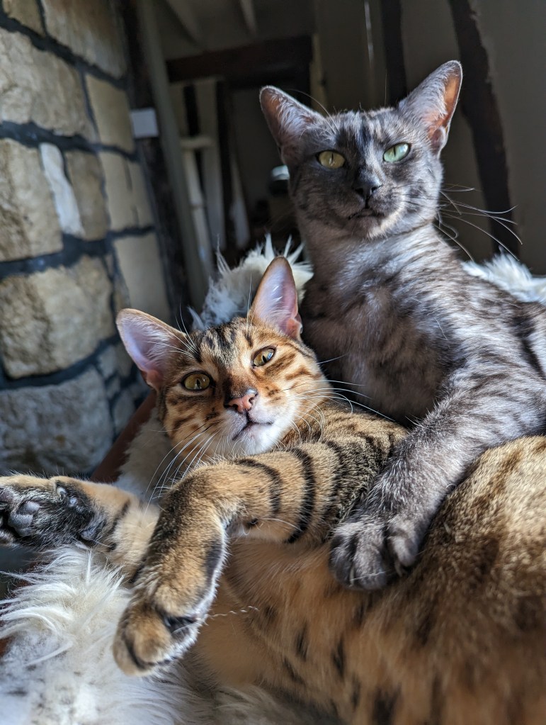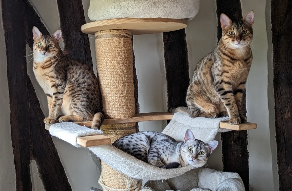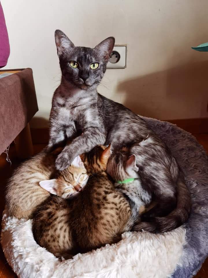 Notre tribu féline n’inclut pas que des Maus Egyptiens. Pour commencer, Pivoine, ma reine-mère, mon premier chat, bientôt 15 ans, elle vit à son rythme tranquillement. Au cours des années, des chats errants nous ont rejoint. En 2016, nous avons accueilli la douce et sociable Mystère accompagnée de sa fille Night plus indépendante que sa maman elle est néanmoins très attachante. Elles ont été suivies par Pitchoune un lundi matin de Septembre 2020; espiègle et joueuse elle ne se laisse approcher que par nous, elle est aussi une redoutable chasseuse. Dernier arrivé et aussi notre seul chat poils longs, Scratchou, aussi beau que gentil, un vrai nounours qui adore les câlins. Comme voue pouvez le constater, tous ont des personnalités différentes et nous les adorons.