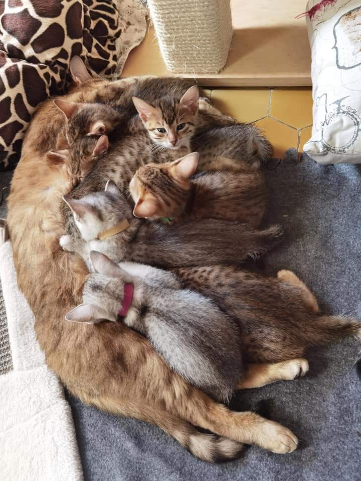 Le 07 Mars 2022 n’a pas été un jour comme les autres à la chatterie Sechem. Ce jour là nous avons eu le grand bonheur de voir naitre 2 portées : 4 Mau Egyptien de couleur silver et 5 Mau Egyptien de couleur bronze. Les 9 chatons ont été élevés par leurs 2 mamans Osiris Band Cleopatra et Sechem Physalis. Un très Joyeux Anniversaire à Iris, Thalia, Tacita et Thuoris (les silvers) et Topaze, Twilight, Taïga, Too Much et Teddy Bear (les bronzes) !