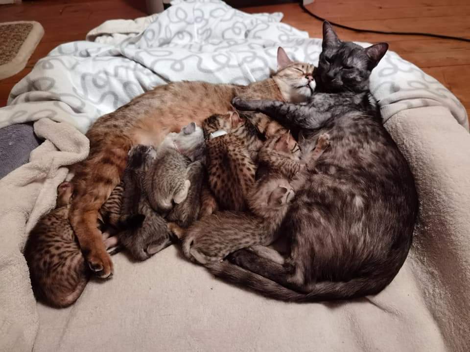 The 07th of March 2022 was not a typical day at the Sechem cattery. This day, we had the great happiness to have 2 litters : 4 silver Egyptian Mau and 5 bronze Egyptian Mau. Both 9 kitten were raised by their 2 mums Osiris band Cleopatra and Sechem Physalis. Happy Birthday to Iris, Thalia, Tacita and Thuoris (the silvers) and Topaze, Twilight, Taïga, Too Much andTeddy Bear (the bronzes) !