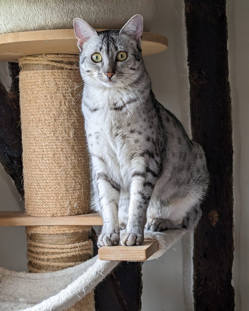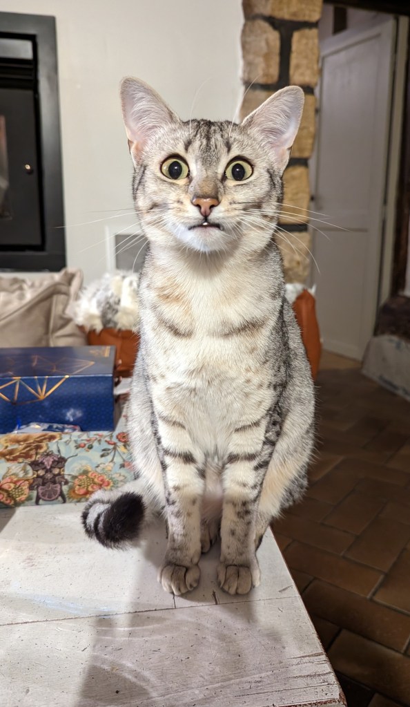 Our feline clan does not only include Egyptian Mau. To start, Pivoine, my queen mother, my first cat, soon 15 years old, she lives quietly. Over the years, some stray cats join us. In 2016, we welcomed the sweet and sociable Mystère, she came with her daughter Night who is more independant than her mother but so engaging. A monday morning in September 2020 Pitchoune arrived on our doormat; mischevious and playful she only let us come near and hug her, she is also a formidable hunter. Last to come and the only one long hair cat, Scratch is as beautiful as gentle, a real teddy bear, he loves to be cuddled. As you can see, all have different personnalities and we love them so much.