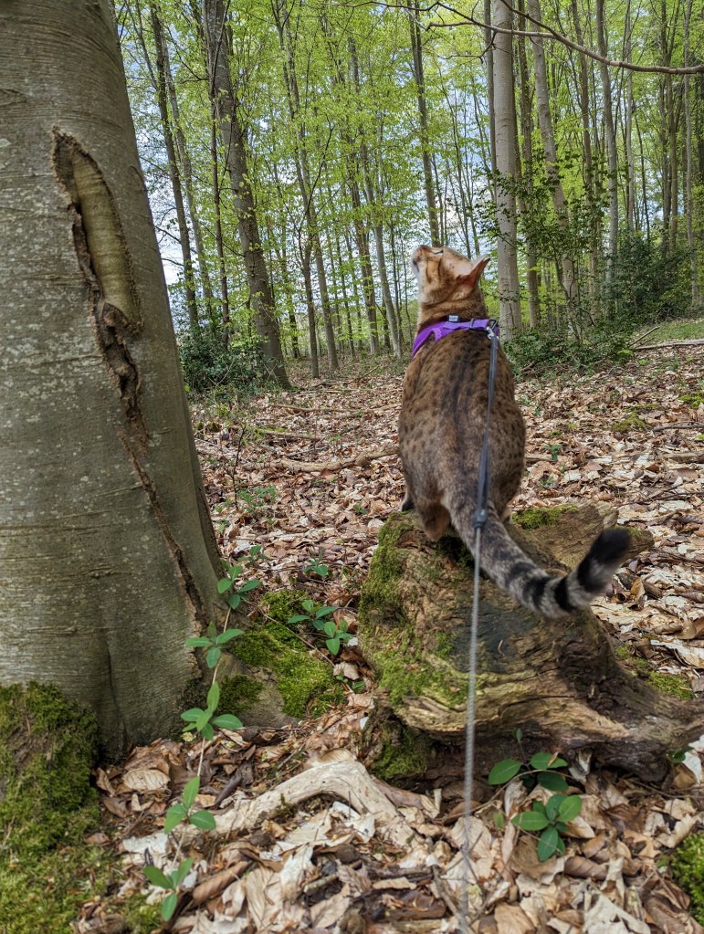 Sechem Pop-Corn enjoyed the nice weather to have his first walk in the wood near home. He appreciated this new environment with good odors. It seems that he was tempted to climb a big tree, a very big tree ; hopefully he changed his mind.